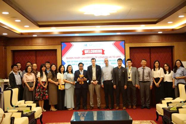 Ảnh 1. Đại diện Đại học Queen Mary chụp ảnh lưu niệm cùng đại diện Lãnh đạo Nhà trường và các đơn vị tham gia buổi làm việc trong khuôn khổ chuyến thăm và làm việc tại UFM ngày 23/3/2026.